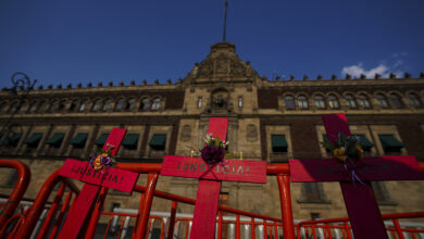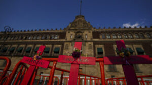 Red crosses with the Spanish word “Justice” hang on the fence of the National Palace where they were placed by demonstrators holding an event coined a national mourning against femicides in the Zocalo of Mexico City, Wednesday, May 18, 2022. (AP Photo/Fernando Llano)