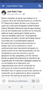 Rubio Trejo en su cuenta de Facebook denuncia el masivo despido de gente que trabajó en el proyecto de la cuarta transformación en el distrito 07 federal de San Luis Potosí por el ineficiente delegado Gabino Morales como represalia por haber denunciado los fraudes que se cometieron en la consulta sobre el nuevo aeropuerto de santa Lucia y Texcoco así como de los 10 programas prioritarios de AMLO donde las boletas fueron “marcadas” por la subdelegada regional Briceyda García Antonio para simular un trabajo que jamás se realizó .