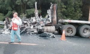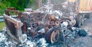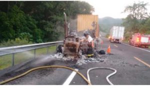 Esta mañana un trailer se incendio en la autovia Rayón -Ciudad Valles chófer logró salir antes de ser consumido por el fuego que abrazo la unidad causando pérdidas totales .