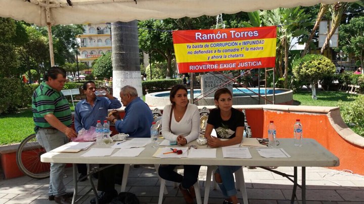 Los manifestantes colocaron una manta frente a presidencia municipal que dice: “Ramón Torres; ya basta de corrupción e impunidad, no defiendas a tu comadre, 1ero la madera y ahora la chatarra; Rioverde exige justicia”.