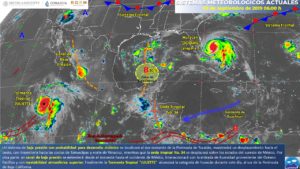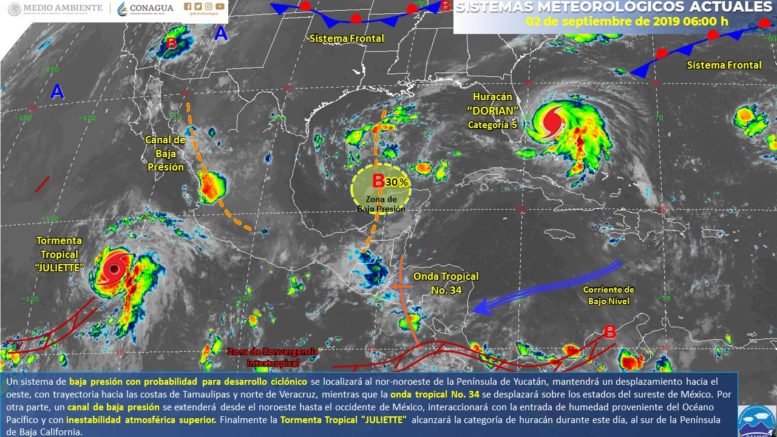 Para hoy, un sistema de baja presión con probabilidad para desarrollo ciclónico se localizará al nor-noroeste de las costas de la Península de Yucatán, mantendrá un desplazamiento hacia el oeste, con trayectoria hacia las costas de Tamaulipas y norte de Veracruz, mientras que la onda tropical No. 34 se desplazará sobre los estados del sureste de territorio nacional. Por otra parte, un canal de baja presión se extenderá desde el noroeste hasta el occidente de México, interaccionará con la entrada de humedad proveniente del Océano Pacífico y con inestabilidad atmosférica superior. Finalmente la Tormenta Tropical “JULIETTE” alcanzará la categoría de huracán durante este día, al sur de la Península de Baja California.