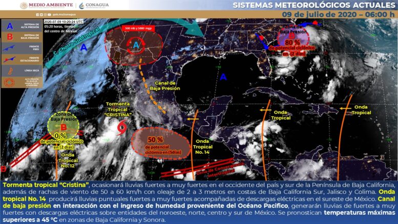 Para hoy, se pronostica que “Cristina” se intensifique a huracán categoría 1 al sur de la Península de Baja California y que ocasione lluvias fuertes a muy fuertes en el occidente del país y en Baja California Sur, además de rachas de viento de 50 a 60 km/h y oleaje de 2 a 3 metros en las costas de Baja California Sur (suroeste y sur), Jalisco y Colima.