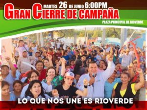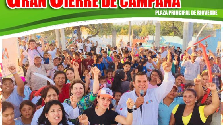 Después de haber tenido multitudinarios eventos en las comunidades de San José Del Tapanco, El Jabalí y Puente del Carmen el candidato de la Coalición PRI, Nueva Alianza y Conciencia Popular Arnulfo Urbiola Román desea repetir la azaña al congregar a miles de personas en la plaza principal de Rioverde para lo que será su cierre de campaña.