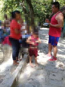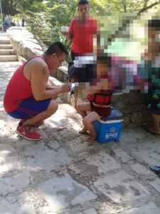 El menor viste short rojo, chaleco salvavidas en color rojo quien después de media hora fue localizado deambulando solo por la orilla del rio, haciéndole entrega a su familiares