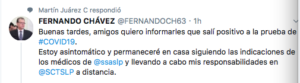 en su twiter Fernando Chávez  explica ” Estoy asintomático y permaneceré en casa siguiendo  las indicaciones  de los médicos de @ssaslp y llevando a cabo mis responsabilidades en @SCTSLP a distancia .