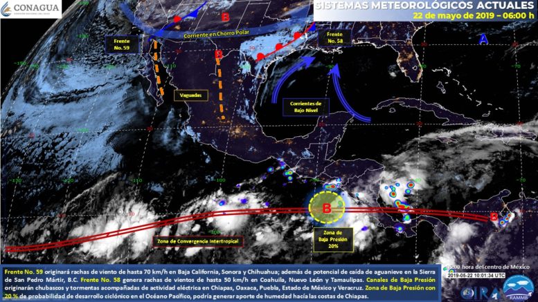Este día, una línea seca interaccionará con el frente frío No. 59, generando intervalos de chubascos y vientos fuertes en el norte y noreste de México; posible caída de nieve o aguanieve en la Sierra de San Pedro Mártir, B.C., además de rachas de viento superiores a 50 km/h en Coahuila, Nuevo León y Tamaulipas. Por otra parte, un canal de baja presión sobre el interior del territorio nacional, y otro más en el sureste mexicano, originarán chubascos con tormentas puntuales muy fuertes acompañadas de actividad eléctrica en zonas del oriente, centro y sureste de la República. Una zona de inestabilidad en el Océano Pacífico con probabilidad de desarrollo ciclónico, localizada al sureste de las costas de Chiapas, podría generar entrada de humedad en el sureste de la República y reforzar el desarrollo de tormentas en dicha región. También se mantendrá ambiente caluroso en gran parte del país con temperaturas muy calurosas en zonas del litoral del Pacífico, litoral del Golfo de México y la Península de Yucatán.