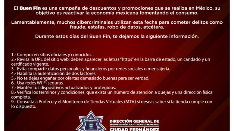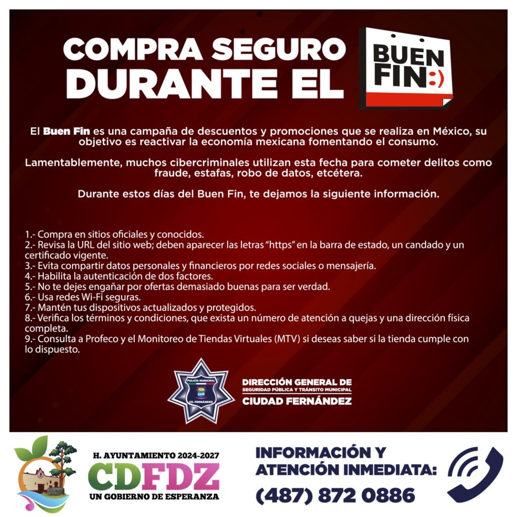 Ante el aumento en el flujo de compras tanto en tiendas físicas como en línea con motivo del “Buen Fin”, el Director de Seguridad Pública de Ciudad Fernández, Néstor Daniel Medina Lugo, emitió una serie de recomendaciones a la ciudadanía para realizar sus compras de manera segura y evitar ser blanco de la delincuencia.