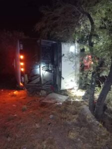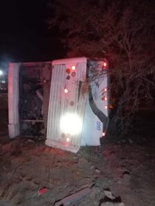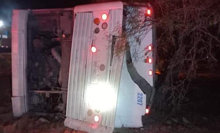 A las 00:10 horas se reporta una salida de camino y volcadura de un autobús de pasajeros en la carretera 57 km 18 al norte.