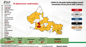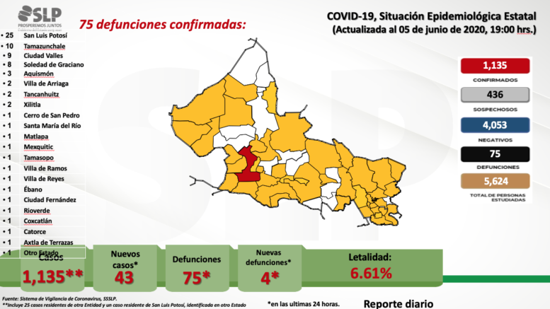 Miguel Lutzow Steiner dio a conocer que San Luis Potosí se incorporaron 43 nuevos casos de coronavirus para llegar a 1,135 casos confirmados de 5,624 personas estudiadas, de las que se han descartado 4,053; la cifra de pendientes de estudio son 436 sospechosos, y el número de lamentables decesos subió a 75, con un índice de letalidad de 6.61%.