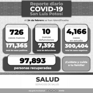 Por segunda semana consecutiva, las estadísticas de contagios y hospitalizaciones por Covid-19 muestran una clara tendencia a la baja: este día, se registraron 726 nuevos contagios. De continuar con este registro a la baja, San Luis Potosí podría continuar en Semáforo Epidemiológico color verde, lo que representaría un importante avance en el combate a la pandemia que libran potosinas y potosinos junto con el Gobierno del Estado.