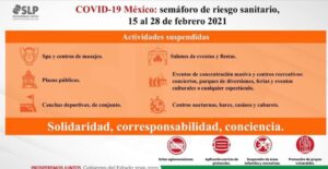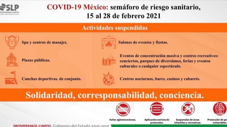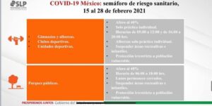 A partir del próximo lunes 15 y hasta el 28 de febrero San Luis Potosí entra a Semáforo color Naranja, aún en riesgo alto de contagio, ya que los indicadores han bajado gracias a la participación ciudadana que han disminuido la hospitalización en cerca de un 50% en las últimas dos semanas, aunque los casos continúan en una meseta alta y es el objetivo como sociedad y autoridades.