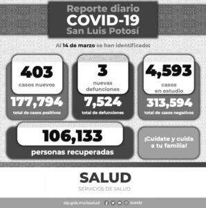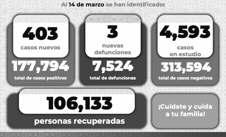 En cuanto al Informe Diario de casos Covid-19, se dan a conocer 403 nuevos contagios confirmados en la Entidad. De esta forma, el Comité Estatal para la Seguridad en Salud y los Servicios de Salud informan que, hasta este día se registran 177 mil 794 casos totales de este padecimiento.