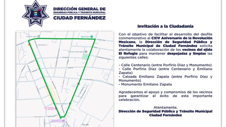 Con motivo de los desfiles conmemorativos al CXIV Aniversario de la Revolución Mexicana, el Director de Seguridad Pública y Tránsito Municipal de Ciudad Fernández, Capitán Segundo de Infantería Retirado Néstor Daniel Medina Lugo, informó que se realizarán cierres temporales de vialidades en distintos puntos del municipio, incluyendo las zonas urbanas y el ejido El Refugio.