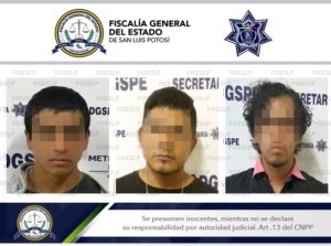 SLP. – En un trabajo conjunto, autoridades de la Secretaría de Seguridad Pública (SSPE) y de la Fiscalía General del Estado (FGESLP), lograron detener a tres personas relacionadas con el robo de vehículos en la zona metropolitana de San Luis Potosí y Mexquitic de Carmona, quienes presuntamente forman parte de una banda que está siendo desarticulada y de la que ya ha habido otros detenidos.