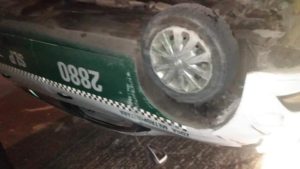 El conductor de un taxi volcó sobre el circuito interior del Río Santiago a la altura del puente San Felipe generando alarma ya que en su cajuela llevaba un tanque de gas.