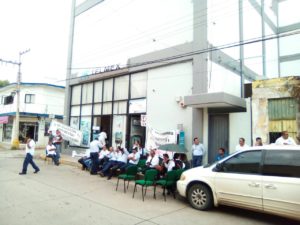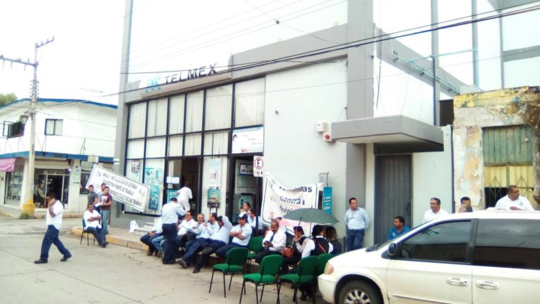 Trabajadored del sindicato de telefonistas de México realizan una manifestación pacífica frente a las oficinas de Telmex de Rioverde .