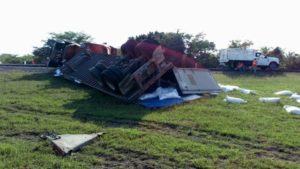 Un tráiler de doble remolque que transportaba azúcar, proveniente de Pánuco, Veracruz, tuvo una falla mecánica y el chofer perdió el control del volante.