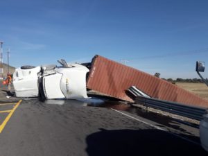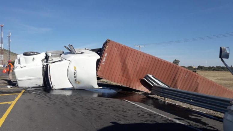 El accidente se registró la mañana de hoy en la carretera 57 tramo San Luis Potosí-Matehuala,un tráiler Marca Kenworth tipo tractor, modelo 2019 en color blanco, placas de identificación 32 AH 1M del S. P. F. Acoplado a un remolque tipo chasis portacontenedor marca Corpus Christi, modelo 2019 en color rojo perdió el control y volcó .