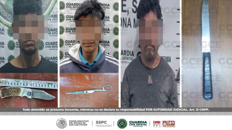 S.L.P.- En diferentes acciones operativas, oficiales de la Guardia Civil Estatal (GCE) detuvieron a tres hombres y a un menor de edad, por el probable delito de portación de armas prohibidas.