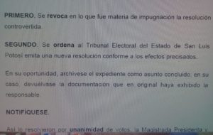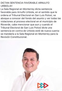 La Sala Monterrey  emitió y determinó que el abogado del partido Revolucionario Institucional  si tenía personalidad para inconformarse contra la resolución que emitió el ceeepac, por lo cual está ordenando que el tribunal estatal electoral entre al estudio de la inconformidad que plantearon y resuelva dando entrada al escrito que no cambiaría en nada la elección del 1 de Julio en el municipio de Rioverde.