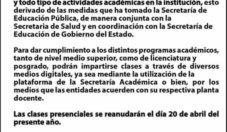 Mediante un comunicado difundido en sus redes sociales, detalló que además de las clases se suspenderá todo tipo de actividades académicas en la institución.