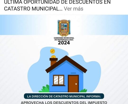 Durante el mes de marzo de 2024 el Gobierno Municipal de Matehuala hace un llamado a las y los contribuyentes que aún no han cubierto el pago del impuesto predial aprovechen la última oportunidad de descuentos Franco Coronado Guerra presidente municipal de Matehuala dijo que para este mes el beneficio es del 5 por ciento.