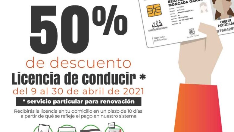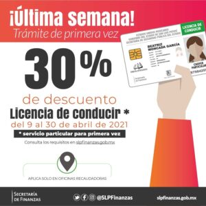 El día 30 de abril vence el plazo del programa de descuentos en licencias de conducir que implementó la Secretaría de Finanzas de Gobierno del Estado. Por lo que se hace un llamado a la ciudadanía para que aprovechen el 50 por ciento para renovación y 30 por ciento para trámite de primera vez. El 50 por ciento aplica exclusivamente en pago a través de medios electrónicos.
