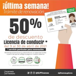 El pago de la renovación de la licencia de conducir se deberá realizar a través de la aplicación móvil “SLP Finanzas”, en la página web www.slpfinanzas.gob.mx, en 16 Centros Electrónicos ubicados en plazas comerciales, oficinas y presidencias municipales o en sucursales bancarias. En oficinas recaudadoras no aplicará el 50% de descuento para este trámite.