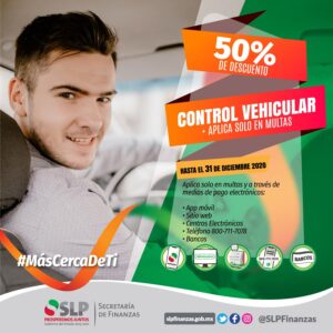 En apoyo a la economía familiar de las y los potosinos la Secretaría de Finanzas de Gobierno del Estado, lleva a cabo la campaña de descuento del 50 por ciento en multas en trámites de control vehicular, en pagos realizados a través de medios electrónicos y bancos.