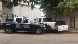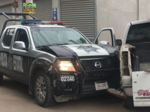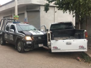 Al ingresar a una calle privada, la unidad policial cerró el paso e impacto contra la camioneta donde al parecer descendieron de un vehículo 4 masculinos uno de ellos sin camisa Presuntamente con un arma de fuego.
