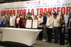 En el evento, Mario Delgado, dirigente nacional de Morena, destacó que esta es la primera firma de un acuerdo de una de las alianzas más exitosas en la historia de la democracia mexicana.