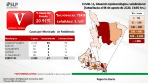 Los 355 nuevos casos están en el rango de 0 a 96 años de edad y se consideran 353 casos de transmisión local y 2 foráneos. Los 29 lamentables decesos son 17 hombres y 12 mujeres, con residencia en la capital (9), Soledad (4), Matehuala (2), Ciudad Valles (5), Rayón, Rioverde, Cerritos, Tamuín, Axtla, Tamazunchale, Tampacán, Huehuetlán y Tancanhuitz. Los decesos tenían factores concomitantes de riesgo como diabetes (14), edad (14), hipertensión (15), obesidad (4), enfermedad renal crónica (3).