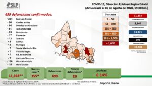 Miguel Lutzow Steiner, vocero del Comité de Seguridad en Salud dio a conocer que San Luis Potosí se incorporaron 355 nuevos casos de coronavirus para llegar a 11,393 casos confirmados de 28,608 personas estudiadas, de las que se han descartado 13,371; la cifra de pendientes de estudio es de 3,844 sospechosos, y el número de lamentables decesos subió a 699, con un índice de letalidad que se ubica en 6.14% decesos por cada 100 casos.