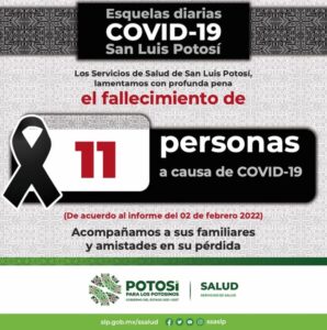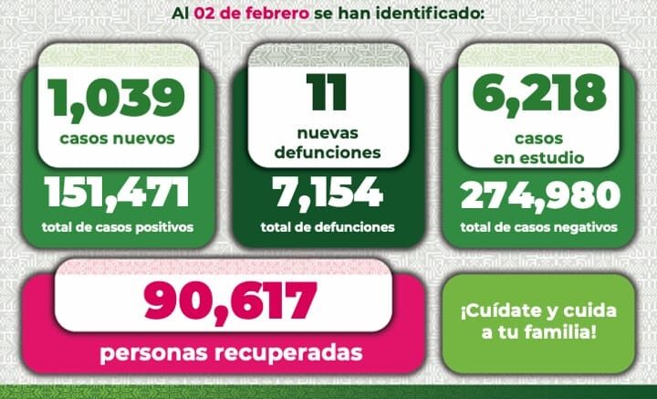 En cuanto a decesos, se reportan 11 nuevos para un total de 7 mil 154 muertes. Las defunciones de este día corresponden a cuatro mujeres y a siete hombres, entre los rangos de edad de 27 a 84 años. Hasta este día, permanecen hospitalizadas 303 personas, de las cuales 35 requieren de respiración asistida.
