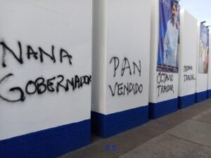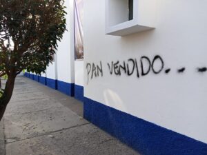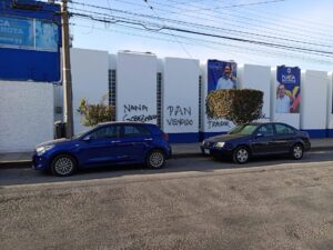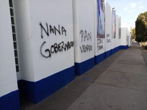 La madrugada de hoy “vándalos “ grafitearon la sede del comité estatal del Partido Acción Nacional en la capital del estado , a dos días de que se realicen las elecciones internas para la elección del candidato a la gobernatura del estado .