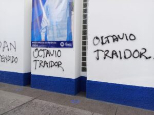 Esta mañana personal que labora en el instituto político encontraron con pintas y consignas en las paredes del edificio lo que caldea los ánimos entre la militancia .