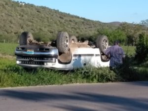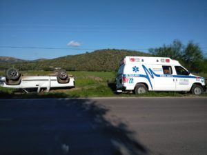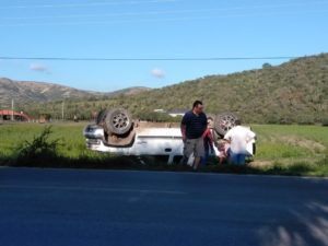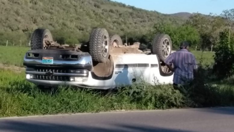 El conductor de una camioneta Chevrolet blanca de cabina y media, el cual se salió del camino débido a que otra camioneta se le cerro invadiendo su carril, provocando que esta se saliera del camino y volcara aparatosamente.