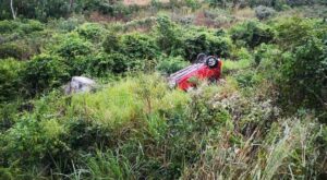 Un vehículo Renault Clio rojo, se salió del camino y volcó hacia un desnivel, en el kilómetro 13 de la carretera federal Valles-Tampico, cerca de la curva del Taninul.