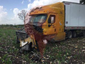 El tráiler cuyo operador presuntamente ocasionó el múltiple y trágico accidente, mismo que portaba razón social Fletes México, color amarillo tipo caja cerrada quedó en posición normal a un costado de la carretera con la parte frontal completamente destruida.