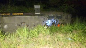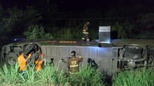 Personal de bomberos de ciudad Valles y socorristas de la Cruz Roja así como elementos de Protección Civil brindaron auxilio a los tripulantes de una autobús que se volcó alrededor de las 3:30 de la madrugada en el kilómetro 4 del libramiento poniente, a la altura del ejido Tampaya.