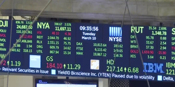 Los intercambios se suspendieron en la bolsa de Nueva York poco después de la caída del 7% del índice S&P 500 en la apertura, en pleno pánico por la pandemia de coronavirus.